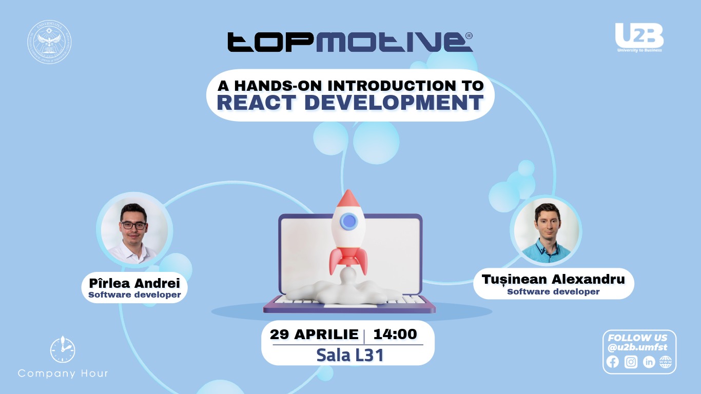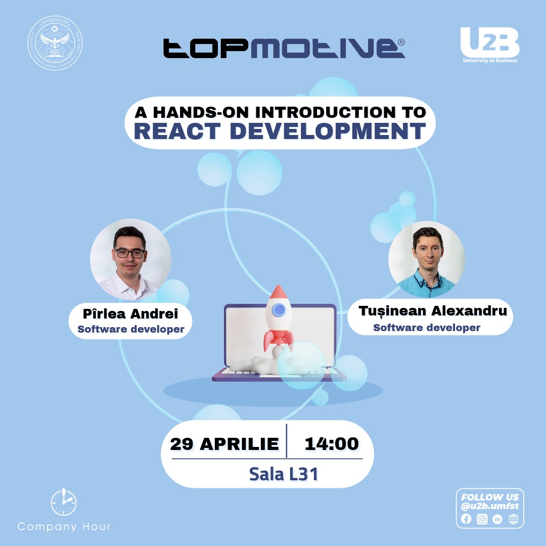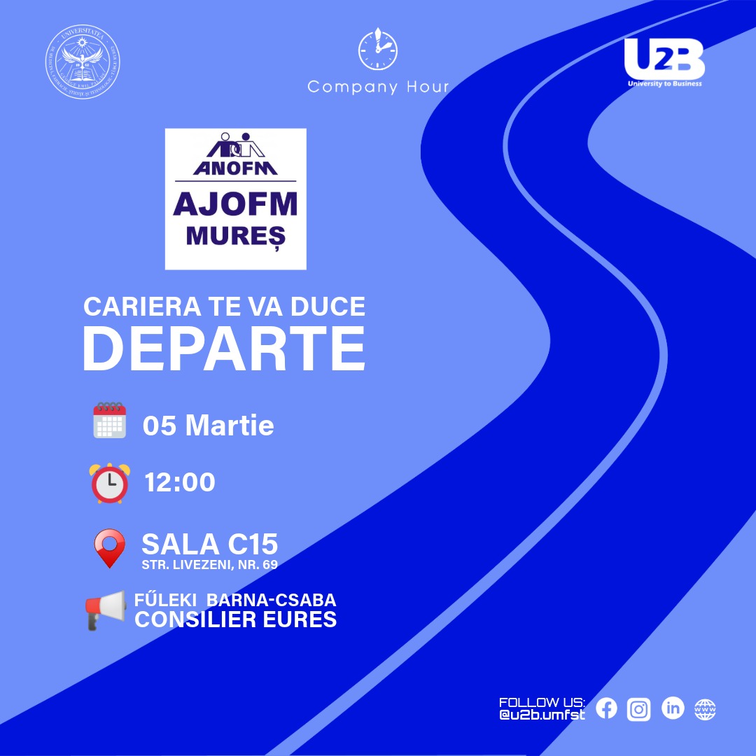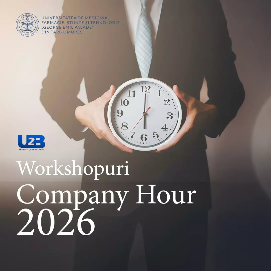 The University to Business – U2B UMFST concept is initiated and developed by the Student Entrepreneurial Society – SAS together with the Department of Labor Market Relations – CRPM, through which we aim to emphasize the special attention the university gives to its relationship with the economic environment, through an active approach aimed at creating sustainable partnerships and projects.